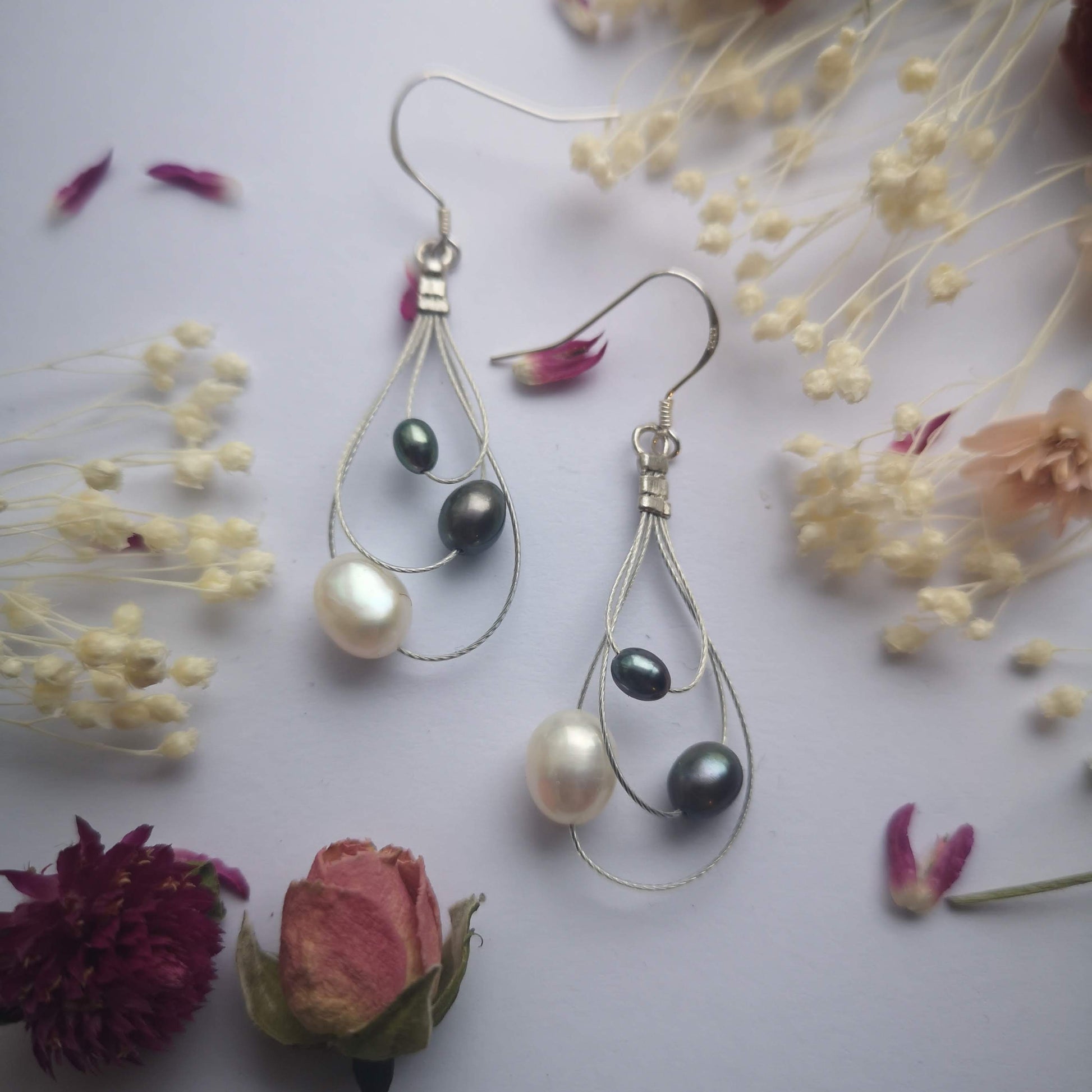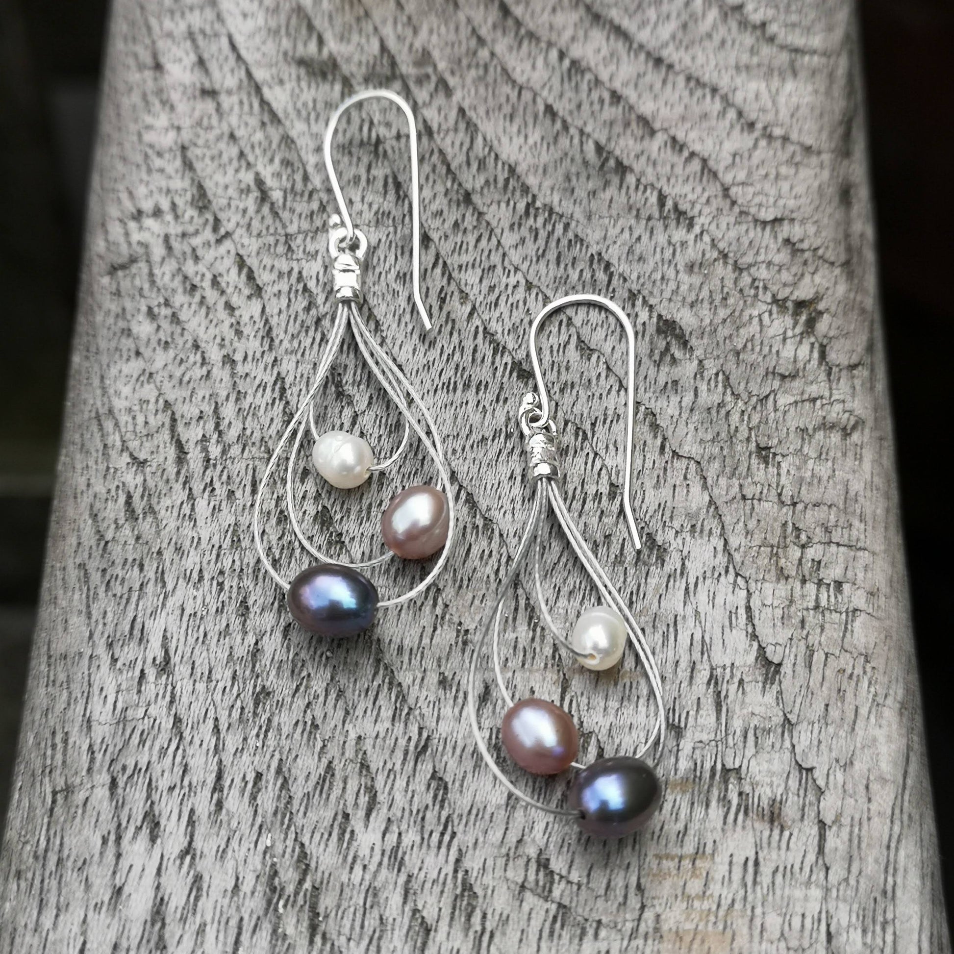 The Galaxy Earrings are a graceful design inspired by the motion of galaxies. Three pearls of different sizes and colours are each set in a sterling silver loop, all hanging together from a silver hook.